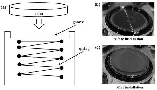 The circular shim installation: (a) installation diagram, (b) before installation; (c) after installation.