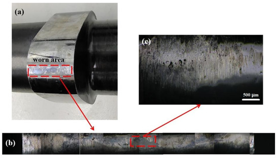The worn area of the cam is shown in Figure 4. The wear behavior mainly occurs at the tip of the cam (Figure 4a). For convenience of observation, the wear area is continuously photographed with an optical microscope (Figure 4b). The most severely worn place is the middle position. There are many longitudinal scratches in this position (Figure 4c). This is because when the cam rotates, the tip first contacts the shim, and then continuously pressurizes until the tip leaves the shim. The cam always rotates in one direction, so the wear marks show regular longitudinal scratches.
