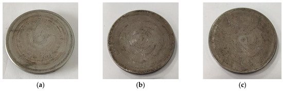 Figure 5 shows macro photos of shims after the engine bench test. Divergent scratches can be clearly seen on the shim surface worn for 350 h in the circumferential direction (Figure 5a). The wear marks of shim worn for 700 h were deepened (Figure 5b). The surface of the shim worn for 1000 h is rough, and the surface is covered with similar wrinkled wear marks (Figure 5c). With the extension of wear time, the wear of shim becomes more serious. Figure 6 presents the worn morphology near the center of the shim. The wear trace at the center of the shim is slight. Divergent scratches are found at a distance from the center of the circle, extending to the edge.