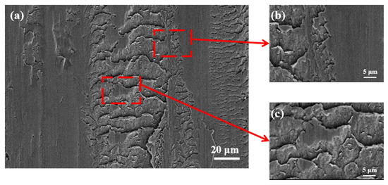 It can be seen from Figure 8 that the worn marks caused by the cam rolling on the shim surface produced serious plastic deformation. Obvious material cracking due to fatigue wear can be observed at the edge of the worn marks (Figure 8b). The plastic flow of surface materials under the action of rolling pressure causes local accumulation (Figure 8c), and the surface damage is very serious at this time.