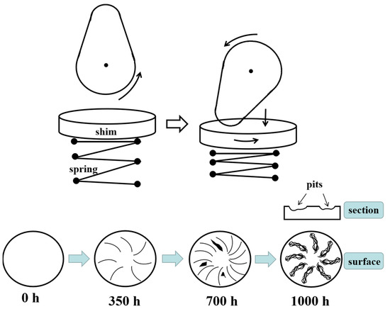 The wear process of shim against cam is shown in Figure 11. When the cam base circle faced the shim, the two did not contact, and the shim was not stressed. When the cam rotated to the tip to contact the shim, the cam rolled the shim and compressed the spring due to pressure. Under the action of the side thrust of the cam rotation, the shim rotates slightly in the circumferential direction. Therefore, the wear marks on the shim surface appeared to diverge from the center to the edge of the shim. When the worn time was extended to 700 h, the wear marks increased. Under the continuous rolling of the cam, the fatigue wear of the shim surface was aggravated, and the plastic deformation of the material surface was serious, even peeling off. After being worn for 1000 h, the plastic deformation of the shim intensified, and the wear marks of material accumulation appeared on the worn surface. The worn marks proved the existence of fatigue. At this time, there were pits in the worn position of the shim. The contact between the cam and the shim is subject to alternating loads, and the contact stress is large. Fatigue wear marks will occur during wear. With an increase in test time, the wear marks will further develop, leading to material spalling and the formation of pits. The weight loss of shim increased due to material spalling. In addition, when the cam wore against the shim, the shear force destroyed the subsurface of the shim, and metal adhesion occurred on the contact surface. Subsequently, during the rolling of the cam, the adhesion position was damaged, and the surface was scratched and even peeled off. Therefore, fatigue wear and adhesion wear occur during the wear process.