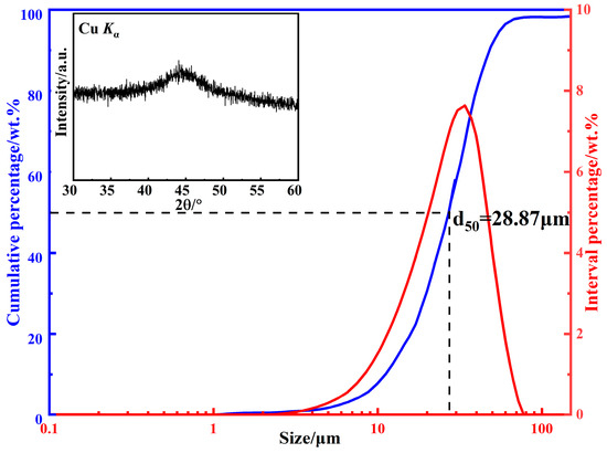The size distribution of the raw powders is shown in Figure 2. The powder size shows a unimodal distribution, d50 is 28.87 μm, and the standard deviation d84/d50 is 1.55, indicating that the powder size distribution range is narrow and the large particles exceeding 100 μm are very few. Compared with large particles, small particles have difficulty in forming an easy magnetization axis due to the regular shape, and then the permeability is lower, but the high-frequency stability can be significantly improved. In addition, the fine powders can not only improve the density of the prepared MPCs, but also reduce the skin depth, thereby reducing the eddy current loss at high frequency [21,22]. The XRD pattern of CA powders is shown in the inset of Figure 2. No sharp diffraction peaks corresponding to the crystalline phases can be observed, and a typical broad peak of the amorphous phase appears near the 45° diffraction angle, indicating that the CA powders are amorphous, and also proving that the novel CA process in this study has an extremely fast cooling rate.