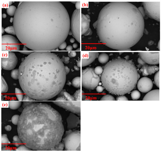 SEM pictures of FeSiBCCr powders treated by different phosphating concentrations: (a) 0.4 wt.%; (b) 0.6 wt.%; (c) 0.8 wt.%; (d) 1.2 wt.%; (e) 1.6 wt.%.