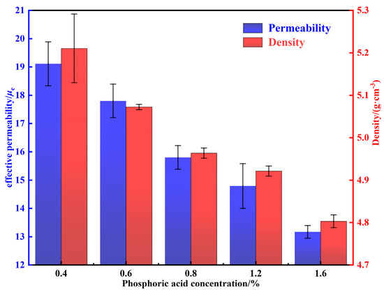 where μ′ is the permeability of powders; g is the content of the non-ferromagnetic phase. μe is inversely proportional to the saturation magnetostriction, internal stress, magneto-crystalline anisotropy constant, and nonferromagnetic impurity content of the material [5]. The density and permeability of MPCs treated by different phosphating concentrations are shown in Figure 7. As the phosphoric acid concentration is increased from 0.4 to 1.2 wt.%, the increase in the content of nonferromagnetic phosphate results in a decrease in the permeability of MPCs. In addition, a large number of micro-scale defects such as cracks and pores are formed in the uneven phosphate layers, which further leads to the reduction of density and permeability [16]. When the phosphating concentration is increased from 1.2 to 1.6 wt.%, the phosphate layers are significantly thickened and the agglomerated particles are increased, resulting in a sudden decrease in density and permeability to 4.80 ± 0.01 g·cm−3 and 13.17 ± 0.22, respectively.
