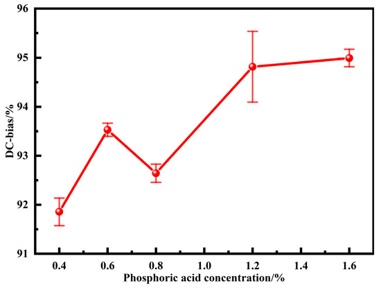 Under the action of an external DC magnetic field, the permeability of MPCs inevitably decreases with the increase of the magnetic field intensity. Therefore, under the development trends of high current and miniaturization, the DC bias performance, which directly affects the performance of electronic components under an external magnetic field, is one of the key properties of soft magnetic materials. Figure 9 shows the DC bias performance of MPCs under different phosphoric acid concentrations. The DC-bias% shows an increasing trend as the phosphating concentration is increased from 0.4 to 1.6 wt.%. Combined with the above analysis, it is clear that the thickness of non-ferromagnetic phosphate layers and the content of air gaps increase with phosphating concentrations, which effectively delays saturation magnetization and thus increases the DC-bias% despite the consequent decrease in density and permeability [16,30].
