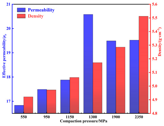 The density and permeability of MPCs under different compaction pressures are shown in Figure 10. With the increase of compaction pressures, the density increases gradually, while the permeability first increases and then decreases. Combined with the discussion in Section 3.2, when the pressure is increased from 550 to 1150 MPa, the density increases from 4.92 to 5.06 g cm−3, the content of internal air gaps decreases substantially, the motion resistance to the magnetic domain walls decreases, and thus the permeability increases from 16.83 to 20.58 [31]. However, when the pressure is increased to more than 1150 MPa, pressure that is too large not only accumulates excessive internal stress in the MPCs, which hinders the displacement and rotation of the magnetic domain walls and limits the magnetization process, but also causes the particles to deform along the direction of uniaxial pressure, which leads to the formation of easy magnetization axes and aggravates the magnetic crystal anisotropy [9,32]. Therefore, as the pressure is increased from 1150 to 2350 MPa, the permeability decreases from 20.58 to 19.52.