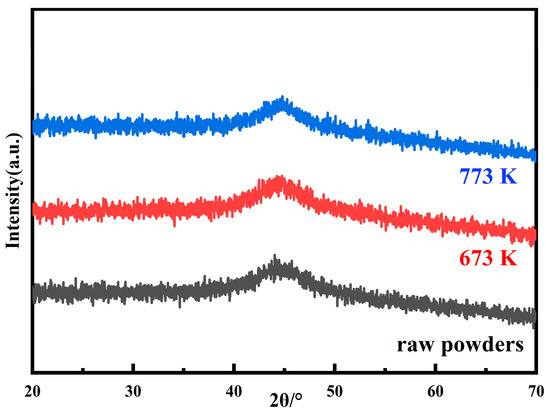 Heat treatment is an important step to improve the soft magnetic properties of the MPCs. The internal stress accumulated in the MPCs during the consolidation can be released by the annealing process, but attention should be paid to the reasonable selection of the annealing temperature [31]. An annealing temperature that is too high will lead to the crystallization of the amorphous matrix and the formation of coarse crystal phases, pinching the magnetic domain walls and deteriorating the soft magnetic properties. Simultaneously, organic insulating agents such as epoxy resins and phenolic resins will also decompose at high temperature, which significantly reduces the resistivity and greatly increases Pcv. Therefore, the annealing temperature generally needs to be controlled below the crystallization temperature [18,30]. Combined with the DSC curve in Figure 4, five annealing temperatures of 423, 623, 673, 723, and 773 K were selected to study the effect of annealing temperatures on the performance of the MPCs. To verify whether crystallization occurs at the annealing temperatures set in this study, the raw powders were annealed at 673 and 773 K for 2 h, respectively, and the XRD patterns are shown in Figure 13. It can be seen that even at the highest annealing temperature of 773 K, the powders still remain completely amorphous, and it can be considered that the MPCs fabricated in this work are all AMPCs (amorphous magnetic powder cores).