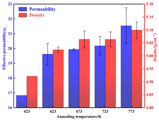 The density and permeability of AMPCs annealing at different temperatures are shown in Figure 14. As the annealing temperature is increased from 423 to 773 K, the density of internal defects decreases, and the micro-scale cracks and pores gradually disappeared [20,32,34]. Therefore, the permeability and density are increased from 16.83 and 4.92 g·cm−3 to 21.54 ± 1.21 and 5.10 ± 0.03 g cm−3, respectively.