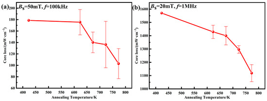 Core losses of AMPCs under different annealing temperatures: (a) Bs = 50 mT, f = 100 kHz; (b) Bs = 20 mT, f = 1 MHz.