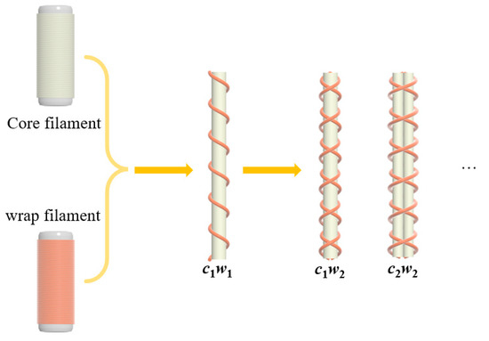 Initial reporting of auxetic yarn was with a helical structure. It was the elastic core filament and the stiff wrap filament that led to the auxetic effect. To improve the stability of the structure and properties, multiple core/wrap structures were provided. As showed in Figure 1, the structure of auxetic yarn was represented by ciwj, where c means core filament, w means wrap filament, and i and j mean the number of core and wrap filaments, respectively. The interactive effects between multiple filaments on tensile behavior and properties have been studied.