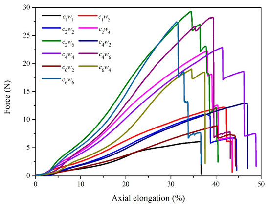 The structure of yarn is one of the most important parameters that relates to the mechanical properties. As shown in Figure 2, axial stretching behavior of auxetic yarn with different structures was carried out. The breaking elongation of auxetic yarns was from 31.3% to 46.83% and the breaking force was from 6.07° N to 29.29° N. Auxetic yarn with c2w6 and c4w2 structures presented the highest breaking forces and elongation respectively.