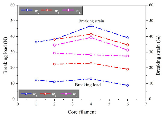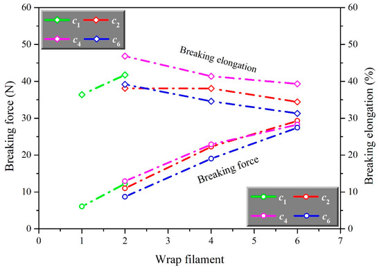As shown in Figure 3, auxetic yarn presented a higher breaking force with the increase of the number of wrap filaments. The breaking force of complex yarn with six wrap filaments was much higher than that with one wrap filament. As showed in Figure 4, the breaking elongation of auxetic yarns firstly increased and then decreased with the increase of the number of wrap filaments. The breaking elongation of auxetic yarns with 4 core filaments was much greater than others. However, the breaking force of auxetic yarns with a different number of core filaments showed a closed value. It indicated that the number of core filaments had little effect on the overall breaking force of complex yarns. Compared with the elastic core filaments, the stiff wrap filaments broke first during the stretching process. The key factors of breaking force and breaking elongation of auxetic yarn were the mechanical property of wrap filament and core filament separately. The increasing wrap filaments played a positive role in the auxetic yarns, conversely, limited the axial extension behavior. This was the main reason that auxetic yarns with different structures showed increasing breaking force and similar breaking elongation.