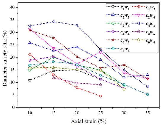 The contour diameters of auxetic yarns under tension were collected and the variety rate based on the initial value is shown in Figure 6. The continuous positive value of the axial strain from 10% to 35% signified the increasing trend of contour diameter of auxetic yarns. During the axial stretching process, the maximum of radial strain of auxetic yarn with c4w2 structure was 35% under 10% axial strain.