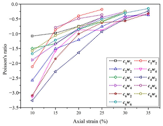Next, Poisson’s ratio with axial strain was calculated and analyzed. As shown in Figure 7, the maximum Poisson’s ratio of auxetic yarn with c4w2 structure was −3.26 under 10% axial strain, which was related to the highest value of contour diameter. With the increase of axial strain, the value of negative Poisson’s ratio gradually decreased, which means the weaker expanding effect of auxetic yarns. The main reason was the state of core filament from straight to completely bending under a compression effect from wrap filaments. Core filament decreased in diameter under axial elongation, which led to the decreasing contour diameter of the auxetic yarn.