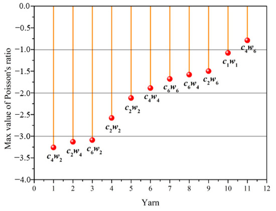 To analyze the relationship between structure and auxetic behavior easily, the maximum of negative Poisson’s ratio of all auxetic yarns were listed in Figure 8 from largest to smallest. Three yarn samples with c4w2, c2w4, and c6w2 structures presented a greater auxetic effect. The maximum negative Poisson’s ratios of all three yarns were higher than −3. Compared with the auxetic yarn with two components of c1w1 structure, most yarns with multiple core/wrap structures showed much more significantly expanding behavior. Moreover, when the number of core filaments was four, the auxetic effect of complex yarns decreased with the increasing number of wrap filaments. The auxetic effect of complex yarns with 2 wrap filaments was higher than that of the complex yarns with six wrap filaments. This verified the effect again that the limitation of more wrap filaments to the deformation behavior of core filaments. All of the experimental results noted the auxetic effect of complex yarns with braided structures.