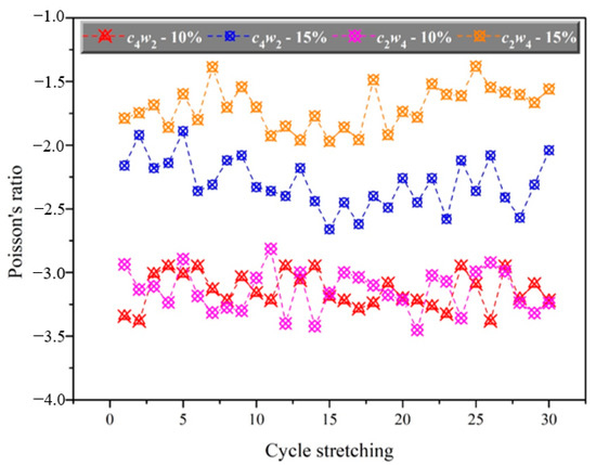 In order to study the stability of structure and property, cycle stretching 30 times at 10% and 15% constant elongation of auxetic yarns with c4w2 and c2w4 structures were carried out. As showed in Figure 9, the corresponding Poisson’s ratio of auxetic yarns with every stretching was provided.