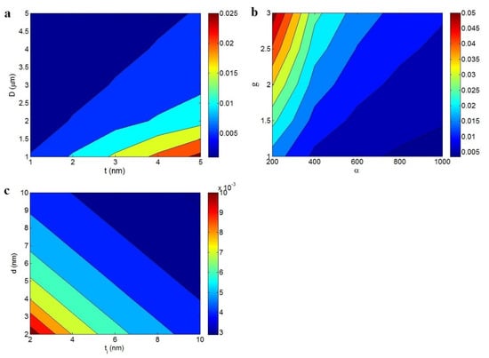 The stimuli of dissimilar factors on the percolation inception were studied using the developed equation (Equation (7)). Each contour plot shows the impacts of two factors on the percolation level at D = 2 μm, t = 2 nm, ti = 5 nm, d = 5 nm, and g = 1.5.