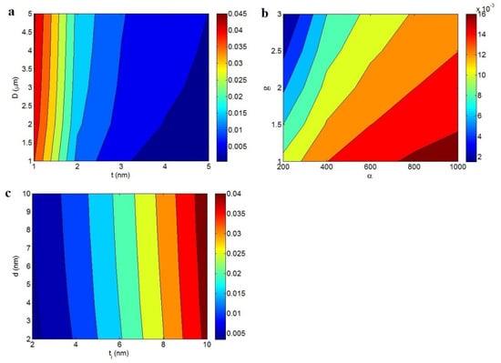 Figure 2a illustrates the impressions of t and D on . The maximum value of = 0.45 was achieved at t = 1 nm and D = 5 μm, although decreased to 0 at t > 4 nm and D < 2.5 μm. Thin and large nanosheets yielded a high portion of percolated nets in the samples, which resulted in the reduction of the percolation level. Thin nanosheets produced a desirable interphase part in the nanocomposites based on Equation (8). Therefore, it is logical to obtain a high portion of percolated nanosheets by thin and large nanosheets, because they make big nets including the interphase part and nanosheets in the nanocomposites.