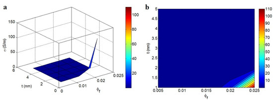 Conductivity when and t are substituted into Equation (14): (a) three-dimensional (3D) and (b) two-dimensional (2D) illustrations.