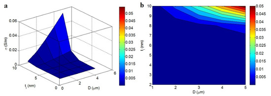 Figure 4 portrays the variations of conductivity at different collections of D and ti. The highest conductivity of 0.05 S/m was obtained at D = 5 μm and ti = 10 nm, whereas a very poor conductivity was obtained at D < 1.4 μm and ti < 7 nm. Thus, the diameter of the nanosheets and interphase depth govern conductivity, and the maximum conductivity was reached for the largest nanosheets and thickest interphase.