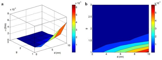Figure 6 shows the effects of d and g on conductivity. The highest conductivity of 6 × 10−5 S/m was achieved at d = 10 nm and g = 1. An insulated nanocomposite was achieved at high g levels. The diagram shows that a large tunneling size and poor agglomeration increased the conductivity, whereas the agglomeration of nanoparticles seriously weakened it.