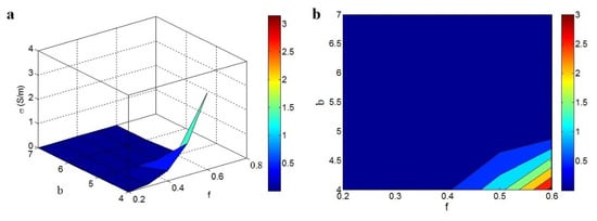 The effect of f on the conductivity is reasonable, as large nets can efficiently transfer charge that establishes desirable conductivity. Additionally, a higher level of b suggests poor conductivity due to the weakened effect of the net volume portion in the conductivity. Recent studies on the original percolation models reported a similar influence of the b exponent on the conductivity, that is poor conductivity was observed when the b exponent level was high [27,28,29]. The current model shows the influences of f and b on the conductivity.