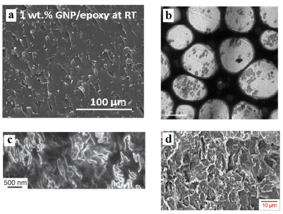 Morphological images of (a) epoxy [49], (b) ABS [50], (c) PS [51], and (d) PVDF [28] graphene systems.