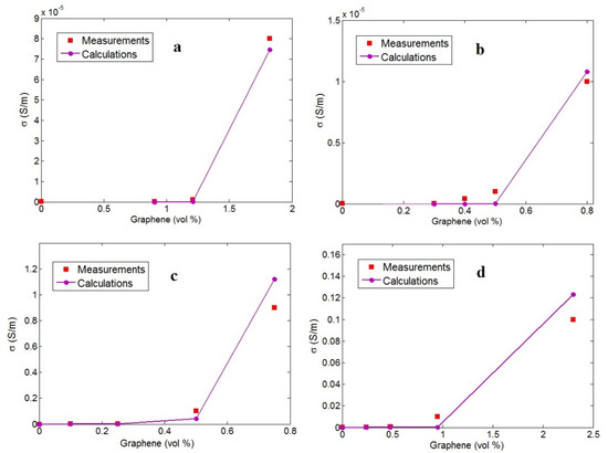 Figure 9 shows the experimented and predicted conductivity values estimated for the examples. The developed model is able to predict the percolation-like behavior of conductivity based on the test results. Consequently, the developed model predicts the conductivity considering the stimuli of the interphase part, tunnels, agglomeration, and nets. The values of b exponent were also calculated, as presented in Table 1. The highest b value of 7.3 was observed in the ABS/graphene nanocomposite due to the poor conductivity levels. Other samples displayed different ranks for the conductivity and b exponent. Since the calculated parameters for the interphases, tunnels, and b are reasonable and meaningful, the developed methodology and its outputs are validated.