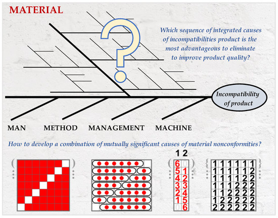 Initially, the main incompatibility of the product is determined (that is, generating the largest waste). Then, a team of experts is selected. This team will work according to the developed method. Then, the source cause of incompatibility is determined, so the place of occurrence of the incompatibility of product. Then, all causes of incompatibility of the product are generated, the so-called potential causes. Then, the categories of these causes are determined. The 5M rule is used for that, i.e., man, method, machine, material management. The potential causes are noted for these categories and then visualized in the Ishikawa diagram. Later, only the causes in the category “material” are analyzed. This results from a literature review, after which it was shown that most of incompatibility causes were identified in the “material” of the product. The second-order causes were determined only for causes from the “material” area. Then, the mutual impact of second-order causes was assessed. The DEMATEL method was used for that. After this method, the most important causes are determined, i.e., causes that have the most significant mutual influence on the occurrence of the incompatibility of the product. The integrated combinations of second-order causes are generated from these most important causes. The developed algorithm will be used for this, which is used, for example, in the MATLAB program. From these combinations a ranking will be developed, and it will be developed by calculating the impact of the integrated sequence (combination) of second-order causes on incompatibility. The higher the ranking value, the greater the influence of the integrated sequence of causes. Hence, it will be possible to determine which causes should be eliminated in the first order to improve the product. If any of the reasons for the incompatibility of the product in a given sequence cannot be eliminated, then on the basis of the prepared ranking, it will be possible to select another possible sequence. This procedure is favorable for the improvement of products according to a continuous improvement of their quality.