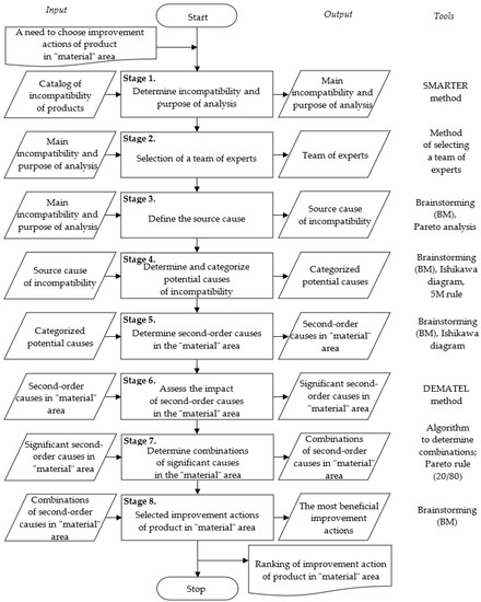 The originality of the study is to propose a new approach to analyzing the incompatibilities of products in the area of materials of the Ishikawa diagram, including rules of quality management methods and tools and multicriteria decision methods. The novelty is a sequential analysis of the incompatibility caused with the materials of products and their reduction to the main causes, i.e., influencing to the most degree the occurrence of product incompatibilities. In addition, a new method developed is developed which will support creating a sequence of integrated actions, including the interaction between important causes of product incompatibility in the material area. The newest is that this method supports creation of a sequence of actions that includes interactions between important causes of product incompatibility. The originality is also that this method supports creating a rank of importance of improvement actions. This ranking allows for the improvement of any product according to the possibilities of enterprises and simultaneously allows for reducing or eliminating products’ incompatibilities. This method will be useful for production companies in selecting the sequence of improvement actions based on their preferences (possibilities). In this context, the possibilities of the enterprise refer to current resources, for example, material, financial, and human. It is the possibility of taking improvement actions in a given period to eliminate the causes of non-compliance of the product. At the same time, the created ranking of the choice of improvement actions will allow reducing the effects influencing incompatibility of the products. Another originality is streamlining the use of the Ishikawa diagram by its combination with the multicriteria decision method, i.e., DEMATEL.