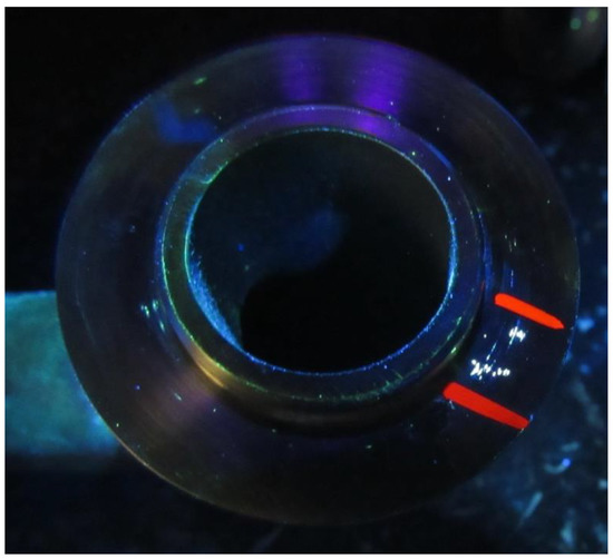 The incompatibility for the analysis was the porosity cluster with the mechanical seal of the 410 alloy. The choice of the mechanical seal of the 410 alloy was based on the individual needs of the company. This is the product of the new generation and, hence, its quality in this company was not stabilized. This product is popular and often used, e.g., in the engineering industry. The results obtained for the mechanical seal can be useful in different applications. It was the main incompatibility (which occurs a lot) in the Polish production company. The porosity cluster (that is, the microporosity of the product) was not visible to the naked eye. However, quality control of the products was realized. The mentioned incompatibility was detected by non-destructive testing (NDT), that is, the fluorescent method (FPI), as shown in studies [5,32]. The porosity cluster was small, which disqualifies the product for production. Detailed characteristics of this type of incompatibility are shown in Ref. [5]. In view of this, the developed method was used to carry out adequate improvement actions. An example of a mechanical seal with a porosity cluster is shown in Figure 4.