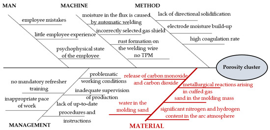 The Ishikawa diagram (herringbone, fishbone) was first developed for all 5M categories, as shown in studies, e.g., [4,17]. The purpose is to separate the potential causes belonging to the “material” area from the other causes generated during brainstorming. Therefore, all potential causes should be listed in the appropriate category of 5M. The decision about the category of cause is made by a team of experts and then this cause is noted on the Ishikawa diagram [4,5,17].