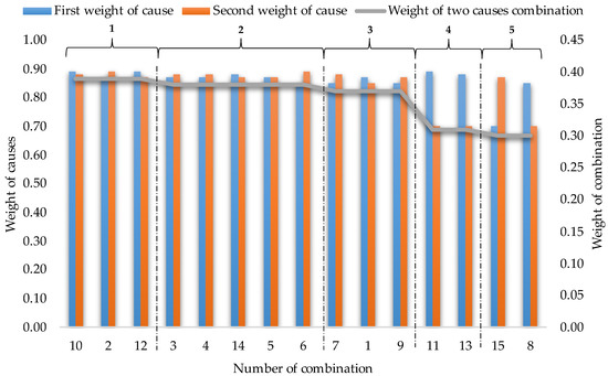 where: x—weight of the i-th cause for the j-th combination, k—number of causes in a given combination, i, j, n = 1, 2,…, m.