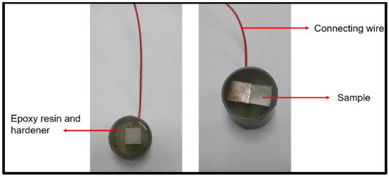 Potentiodynamic polarisation involves altering the potential of the metals, causing one metal to become more noble than the other through the passage of an electric current []. It provides crucial information regarding the sensitivity and passivity range of metals with regard to pitting corrosion [,,]. It also generates a polarisation curve whose slope (Tafel slope) indicates the corrosion potential and corrosion rate at any given condition []. The samples for the corrosion test were sectioned into 1 cm × 1 cm (for single BMs) and 1 cm × 2 cm (for the fused samples), as depicted in Figure 3. Subsequently, an electric wire was connected to the samples by soldering followed by metallurgical preparation as before.