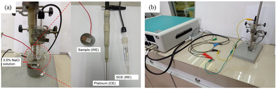 (a) Three-electrode electrochemical cell arrangement in the experiment with the pictures of the working electrode, counter electrode and reference electrode. (b) The full setup connection of the potentiodynamic polarisation testing.
