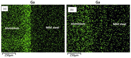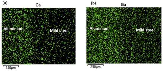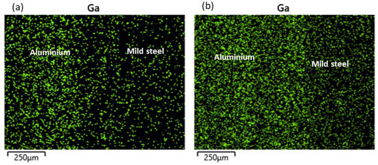 At the reaction layer (spot 2), the composition of Ga was found to be lower with the increasing bonding temperature as the higher temperature facilitated the migration of Ga to the BM regions (Table 3). The elemental mapping of Ga across the joint is presented in Figure 6. At lower temperatures, most of the Ga appears to have migrated to the aluminium BM (Figure 6a). However, upon increasing the bonding temperature, sufficient energy was available to support the migration of the atoms to the mild steel BM region accounting for the reduction in the concentration of the Ga atoms in the aluminium BM region and a more uniform distribution of the element across the bonded BMs (Figure 6b). More so, a slight increment in the BM composition at the reaction layer was also observed with a reduction in the bonding temperature. Additionally, it was observed that the composition of aluminium (wt.%) in this region is greater than that of iron at any given time. This is due to the former’s lower potential activation energy than the latter.