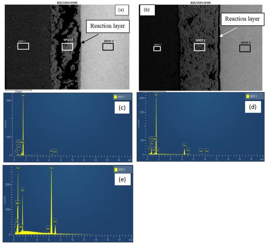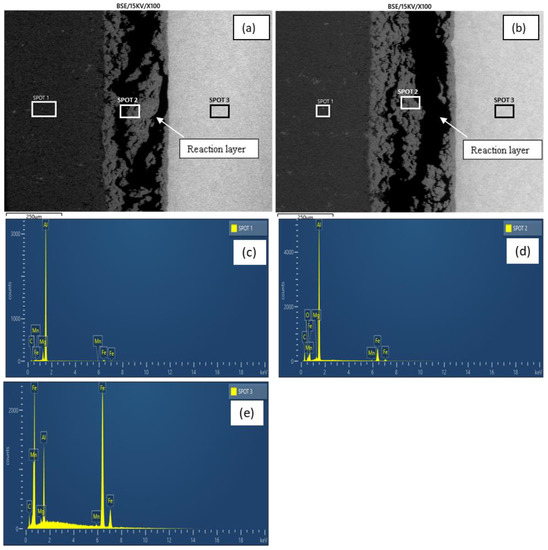 Figure 7a,b show the micrographs of samples E and F, respectively. As revealed by the micrographs, increasing the holding time from 60–120 min at a constant bonding temperature (550 °C) and surface roughness (800 grit) resulted in an increased reaction layer. The increment provided sufficient time that facilitated the growth of the reaction layer (Figure 7b). Additionally, a better coalescence was readily discernible at the faying surface in sample F with an increased holding time relative to sample E. This was achieved through plastic deformation accompanied by residual stress release and plastic flow between the BMs []. As revealed by the EDX analysis (spots 1 and 3), the holding time increment generally resulted in a slight reduction in the elemental composition of the BM regions (Table 3). Figure 7c–e show sample F’s peaks of the EDX analysis.