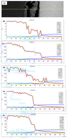 (a) Direction of EDX linescan; (b) Sample E; (c) Sample F; (d) Sample G; (e) Sample H; (f) Sample I.