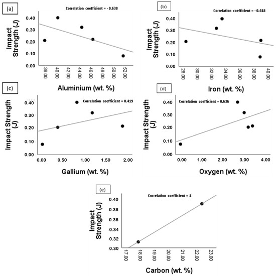 Scatter plot of the impact strength against the elemental composition (wt.%) of the reaction layer: (a) Impact strength against Al; (b) Impact strength against Fe; (c) Impact strength against Ga; (d) Impact strength against O; (e) Impact strength against C.