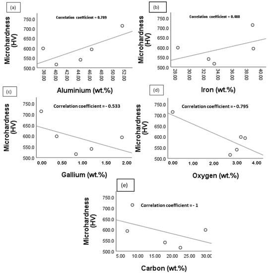 Scatter plot of the microhardness against the elemental composition (wt.%) of the reaction layer: (a) Microhardness against Al; (b) Microhardness against Fe; (c) Microhardness against Ga; (d) Microhardness against O; (e) Microhardness against C.