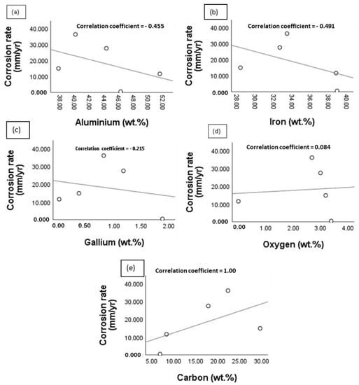 Figure 16 shows the scatter plot of the corrosion rate of the reaction layer against the elemental composition. The analysis revealed a negative correlation between the corrosion rate (mm/yr) and Al, Fe and Ga compositions (wt.%). The respective correlation coefficients were found to be −0.455, −0.491 and −0.215. A perfect positive correlation was also obtained for C, while a weak positive correlation (coefficient = 0.084) was obtained for O. Consequently, it can be inferred that increasing the Al, Fe and Ga content is likely to improve the corrosion property of the joint. Likewise, the corrosion behaviour would be likely impaired when the C and O contents are elevated.