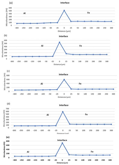 Expectedly, the microhardness of the aluminium BM is about 50% that of the mild steel, as shown in Table 4. However, for all samples, the highest microhardness was observed in the reaction layer, reaching a maximum of 713.5 HV in sample I. Increasing the holding time by 60 min at a constant bonding temperature (550 °C) and surface roughness (800 grit), i.e., samples E and F, resulted in a corresponding increase in the maximum microhardness of the reaction layer by 23.9 HV. Contrastingly, the impact strength decreased by 0.078 J. Figure 17a,b show the microhardness distribution profiles for samples E and F, respectively. Antithetically, a drastic reduction of 77 HV was recorded when the bonding temperature was increased by 25 °C at a constant holding time (60 min) and surface roughness (800 grit), i.e., samples E and H. This resulted in a parallel improvement in the impact strength by 0.177 J. The microhardness profile of sample H is presented in Figure 17d. An increment (81.8 HV) was also observed when the grit size was increased to 1200 (samples E and G). This led to a corresponding reduction in the impact strength by 0.186 J. Figure 17c,e present the microhardness profile of samples G and I, respectively.