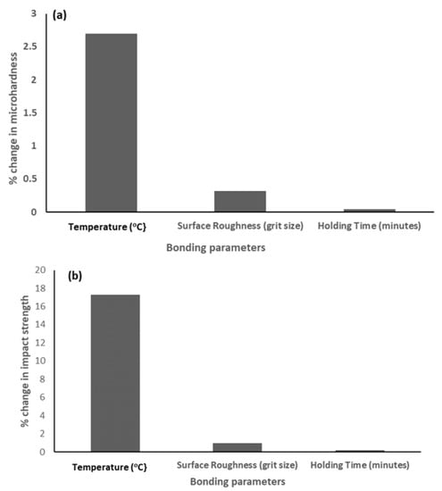 Sensitivity of the joint’s mechanical properties to 1 % change in bonding parameters: (a) Microhardness; (b) Impact strength.