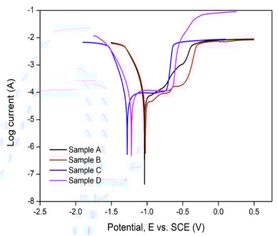 Table 5 revealed that the heat-treated mild steel (sample A) has a corrosion rate of 8.1205 mm/year relative to 5.9473 mm/yr (sample B) obtained without heat treatment. Likewise, the heat-treated aluminium BM (sample C) exhibited a higher corrosion rate of 1.4302 mm/yr compared to the 0.47715 mm/yr obtained without applying heat treatment (Sample D). Consequently, the application of heat treatment resulted in a 36.5% and 199.7% increase in the rate of the degradation of mild steel and aluminium BMs, respectively, which is evident in the shift of the potential to the left in the Tafel plot (Figure 19). This implies that despite the aluminium BM exhibiting a relatively low corrosion current compared to the mild steel, the corrosion behaviour of the former is more sensitive to heat treatment than the latter. The superior corrosion properties of the aluminium BM may be attributed to their position in the galvanic series, as mild steel is relatively more susceptible to oxidation compared to the former []. A lower corrosion current density is attributed to the formation of corrosion products on the electrode surface, which act as barrier films to protect the surface from further degradation, thus enhancing the corrosion resistance []. The increase in the rate of degradation on the application of heat treatment might be attributed to the reduction in the rate of formation of these products on account of the change in BM morphology facilitated by the heat treatment process.