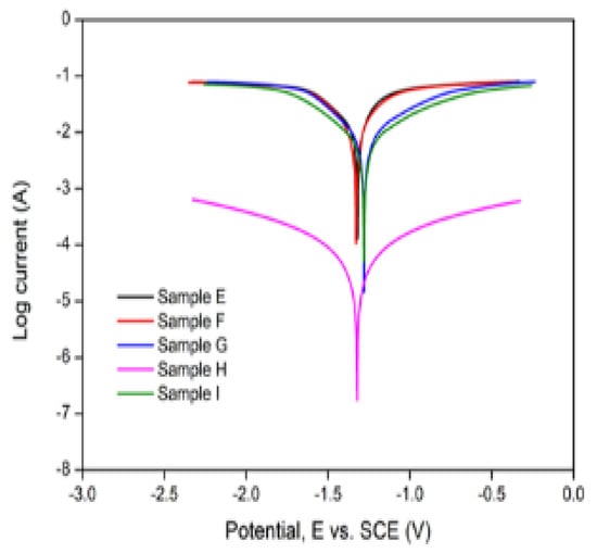 Meanwhile, for the bonded samples (E–I), the rate of the degradation of the joints was found to be 35.948 mm/yr, 27.38 mm/yr, 14.853 mm/yr, 0.517 mm/yr and 11.545 mm/yr for samples E–I, respectively. Sample H exhibited the least degradation rate corresponding to a current density of 0.0000445 A/cm2. Increasing the holding time from 60 to 120 min at a constant temperature (550 °C) and surface roughness (800 grit), i.e., samples E and F, resulted in a corresponding decrease in the degradation rate of the reaction layer. Likewise, increasing the bonding temperature from 525 to 550 °C at a constant holding time (60 min) and surface roughness (800 grit), i.e., samples E and H, resulted in a more drastic reduction in the reaction layer degradation rate. Contrastingly, comparing samples G and I, it is observed that increasing the grit size from 800 to 1200 at a constant bonding temperature (550 °C) and holding time (60 min) resulted in a corresponding increase in the interlayer degradation rate from 11.545 mm/yr to 14.853 mm/yr. Thus, it can be deduced that while the bonding temperature and holding time are negatively correlated with the corrosion rate, the grit size (surface roughness) positively correlates with the latter. The increase in the corrosion rate with an increased grit size might be attributed to an increase in the BM and Ga composition (wt.%), while its reduction owing to increased temperatures and longer holding times might be due to their reduction at the reaction layer.
