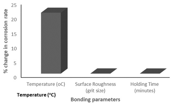 Additionally, a 1% change in the bonding temperature, surface roughness and holding time would require corresponding 20.96%, 0.057% and 0.045% changes in the corrosion rate, respectively. This implies that the interlayer degradation rate is most sensitive to the bonding temperature and least sensitive to the holding time. The sensitivity of the corrosion rate to the bonding parameters is presented in Figure 21. The effect of the gallium interlayer on the corrosion behaviour of the joints is investigated by considering samples E and I. Correspondingly, the introduction of the gallium interlayer at a constant bonding temperature (550 °C), holding time (60 min) and surface roughness (800 grit) resulted in a reduction in the degradation rate from 35.948–11.545 mm/yr. In other words, the gallium interlayer’s introduction improved the corrosion behaviour of the weld joints by 67.9%.