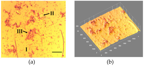 (a) A microscopic projection image of a marine biofilm grown on glass slides (14-day old) in Baltic Sea coastal waters (Gulf of Gdańsk, Poland) collected in August 2018; covered area 460 × 570 μm. Black arrows indicate the different reflective structures containing bare glass substratum (I), silica frustules of diatoms (II), and amorphous material (III). Marker bar is 10 μm; distance scale 36 pixels = 10 μm. (b) 3D reconstructed image from (a); morphological film structure parameters: total surface coverage f = 18.3%, mean thickness = 43 μm, roughness fluctuation coefficient = 0.162, biovolume = 35,800 μm3, fractal dimension = 1.64, Hopkin’s aggregation index = 2.79, AC = 0.47, diatom abundance = 6.3 × 104 ind. cm−2.