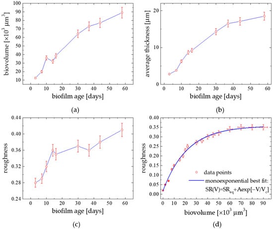 Structural parameters temporal development of a marine phototrophic biofilm grown on glass slides in natural seawater (Baltic Sea, Gulf of Gdańsk, Poland in August–October 2018); (a) biovolume, (b) average thickness, (c) Rrms roughness, and (d) correlation between biofilm roughness and biovolume; the line represents the monoexponential fit to the data (R = 0.99).