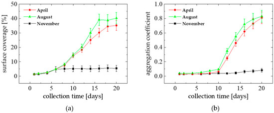 Biofilm surface coverage (a), and aggregation coefficient (b) versus sample collection time, for natural marine biofilm formation on a glass substratum in experiments performed in the Baltic Sea (Gulf of Gdańsk, Poland) in different organic matter production seasons (April–November 2018).