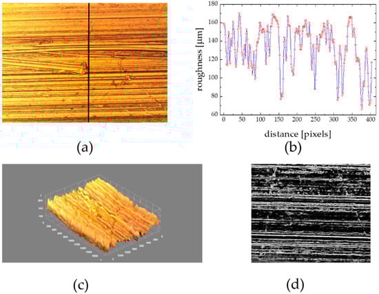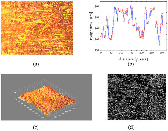 (a): A microscopic image of Al surface roughened with a sandpaper (grade 400), (b): roughness height profile along the line from (a), (c): 3D surface morphology from (a) derived with ImageJ routine, (d): (a) processed with “find edges” procedure; covered area x = 560 and y = 460 μm. Distance scale 180 pixels = 50 μm; Rrms roughness = 1.73 ± 0.43 μm; roughness fluctuation coefficient η = 0.178 ± 0.016.
